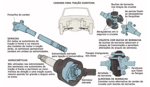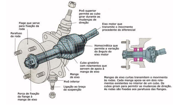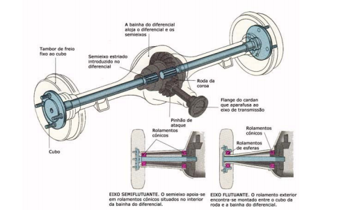 Apoio dos semi eixos - A classificação dos eixos depende do modo como os semieixos e os cubos das rodas estão apoiados. Em todos os tipos de eixos, as extremidades interiores dos semieixos estão ligadas aos planetários do diferencial. No eixo semiflutuante cada um dos semieixos é apoiado, na sua extremidade interior, por um rolamento que também serve de apoio ao diferencial. Na extremidade exterior encontra-se um rolamento entre o eixo e o interior da bainha ao diferencial. N