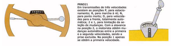 PRNDL é a sequência mais usual. Colocando a alavanca na posição D, obtém-se toda gama de mudanças da mais alta à mais baixa, utilizando todas as velocidades que imprimem movimento para frente. A seleção das mudanças depende não só de um regulador comandado pela velocidade, mas também da posição do pedal do acelerador.
