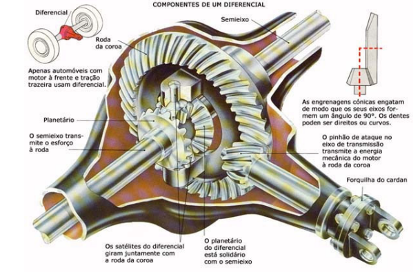 Quando um automóvel faz uma curva, as rodas do lado de dentro percorrem uma trajetória menor do que a percorrida pelas rodas do lado de fora. Se ambas as rodas motrizes estivessem rigidamente fixas a um único eixo, acionado pela roda de coroa, teriam de rodar à mesma velocidade, o que levaria à derrapagem da roda que percorre o menor trajeto. A fim de evitar este inconveniente, o eixo apresenta-se dividido em dois semieixos, cada um dos quais é movido independentemente pelo diferencial para que, quando a roda interior diminui de velocidade, a exterior acelere, girando a roda de coroa à velocidade média das rodas.