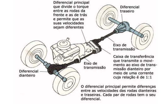 Em prise, a desmultiplicação proporcionada pela redução do diferencial oscila entre 6,5:1 3:1, isto é, tomando como exemplo a relação 3:1, o eixo de transmissão completa três rotações por cada rotação das rodas.