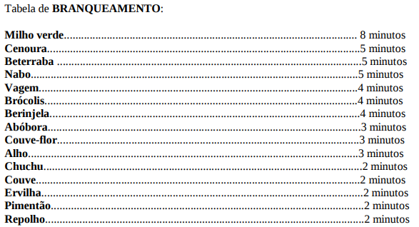 Coloque uma panela com aproximadamente 3 litros de água para ferver. Quando estiver fervendo, coloque os vegetais a serem branqueados (500gm) em uma peneira própria e mergulhe-os na panela, contando o tempo a partir do momento em que a água entrar em ebulição, observe na tabela. Retire-os e passe por sob a água corrente ou em uma bacia com água com gelo. Enxugue-os e embale-os, retirando o ar. A melhor embalagem para as hortaliças branqueadas é o saco plástico.