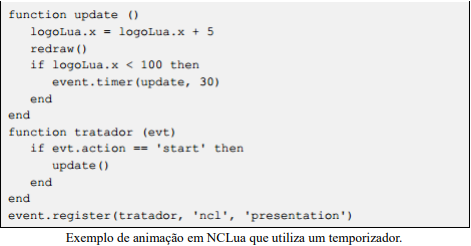 NCL é uma linguagem declarativa que possibilita o desenvolvimento de aplicações multimídia com sincronismo espaço-temporal, entre objetos de mídia, como áudio, vídeo, imagem e texto. Com o intuito de ampliar as aplicações que podem ser desenvolvidas o NCL suporta objetos escritos em linguagem Lua, denominados de objetos imperativos NCLua, o NCLua é uma extensão da linguagem Lua criada para o desenvolvimento de objetos, programas entre outras coisas para o Ginga. A extensão NCLua é específica para o Ginga e por isso não faz pertence a biblioteca padrão da linguagem Lua, sendo este um dos diferenciais do NCLua para a linguagem pura de Lua.