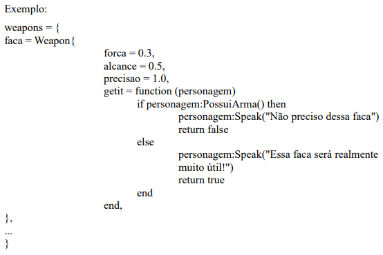 Lua pode ser utilizada como linguagem de configuração para viabilizar comportamentos ou ações que serão realizadas ao longo do jogo, fazendo associação de valores as variáveis abaixo há um exemplo de como isso pode ser feito utilizando-se de tabelas para configurar características de armas e possíveis diálogos que possam aparecer para a determinada arma.