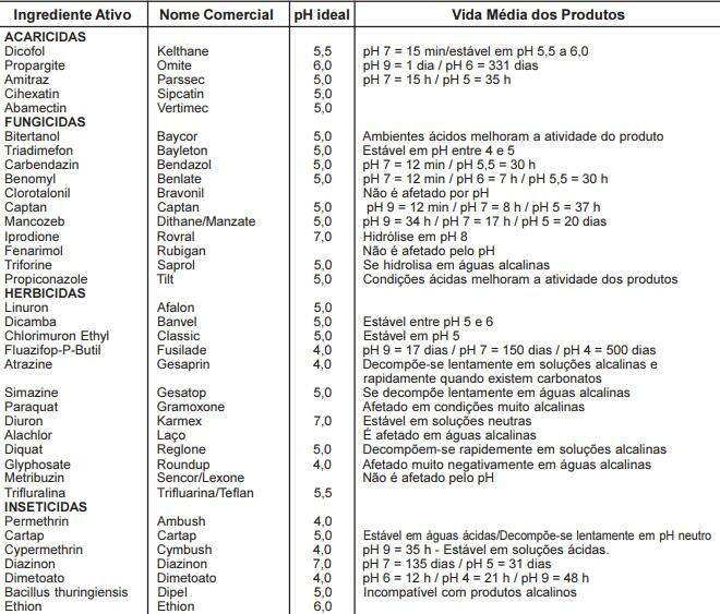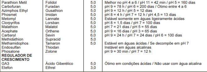 O pH da água varia em cada fonte e algumas são ricas em minerais. Água com valor em pH 3 a 9, nessas condições de acidez ou alcalinidade pode influenciar na atividade biológica dos defensivos agrícolas: Herbicidas, Dessecantes, Desfolhantes, Inseticidas, Fungicidas, Acaricidas, Mosquiticidas, Carrapaticidas e Reguladores de Crescimento Vegetal. A maioria dos produtos químicos utilizados nos controles de ervas daninhas, pragas, doenças, quando veiculados em água com pH alcalino pode sofrer instabilidade e paralisam ou reduzem o processo químico por hidrólise alcalina.