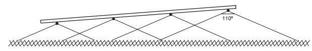 Regulagem do ângulo de pulverização - Esse mecanismo permite que o operador faça o direcionamento da aplicação de acordo com o vento, e o resultado é a diminuição da deriva. A angulação da pulverização também melhora a penetração de defensivo na planta. De acordo com a velocidade e sentido do vento, o operador não precisa interromper a aplicação e com isso a produtividade do pulverizador aumenta
