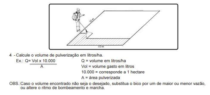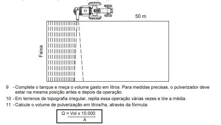 OBS.: Caso o volume de pulverização não seja o desejado, aumente ou diminua a vazão, através da válvula reguladora, ou aumente ou diminua a velocidade.