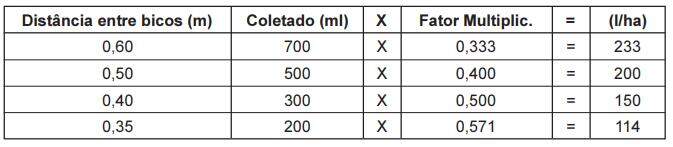 Para obter o volume de aplicação sem aplicar fórmulas, basta checar o tempo que o trator leva para percorrer 50 metros, e coletar o volume durante este mesmo tempo. Multiplicar o valor do n. coletado(ml), pelo fator de conversão correspondente ao espaçamento entre bicos.