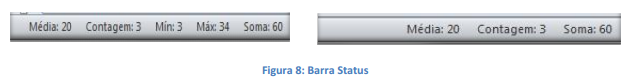 Quando selecionamos duas ou mais células com números aparecem na parte inferior (barra de status) por padrão são exibidas três informações de estatística: média, contagem e a soma. Quando são textos apenas aparece apenas à contagem. Podemos acrescentar ou tirar outras informações clicando na barra de status com o botão direito do mouse.