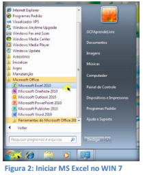 • Clicar no Botão Iniciar e apontar para Programas. Levar até o atalho do Microsoft Office Excel 2010 (que poderá estar agrupado dentro de outro menu chamado Microsoft Office).
