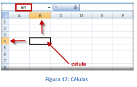 É simplesmente o cruzamento de uma linha com uma coluna. Na figura ao lado podemos notar que a célula selecionada possui um endereço que é o resultado do cruzamento da linha 4 e a coluna B, então a célula será chamada B4, como mostra na caixa de nome logo acima da planilha.