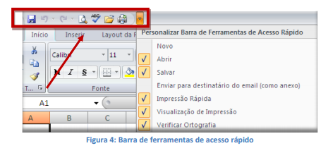 Essa barra localizada na parte superior esquerdo, ajuda a deixar mais perto os comandos mais utilizados, sendo que ela pode ser personalizada. Um bom exemplo é o comando de visualização de impressão que podemos inserir nesta barra de acesso rápido.