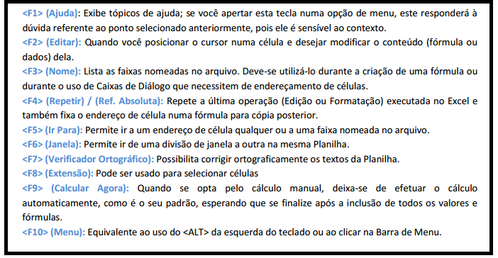 Alguns comandos do MS Excel podem ser executados pelas chamadas Teclas de Função. Estas teclas vão de até .
