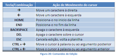 Os comandos de edição estão disponíveis quando se aperta a Tecla de Função , sobre alguma fórmula, valor ou texto, os quais são descritos em seguida: