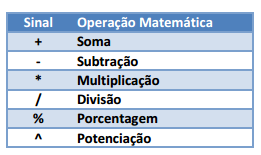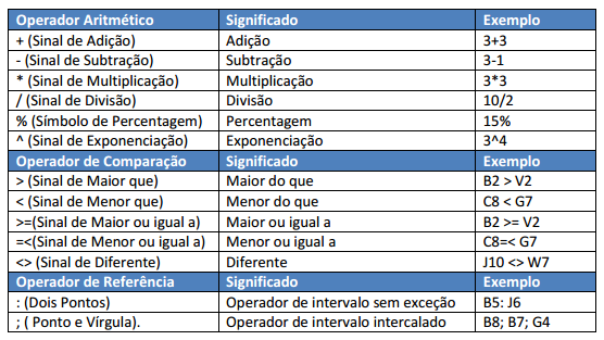 Toda fórmula, por mais simples que seja, deve ser iniciada com o sinal de Igualdade (=). A digitação deste sinal prepara o Excel para o início de um cálculo. As informações armazenadas nesta modalidade utilizam os seguintes operadores aritméticos: