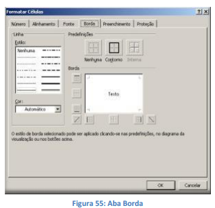 • Borda: Clique em um estilo de linha na caixa Estilo e clique nos botões desta seção para aplicar bordas personalizadas às células selecionadas. Você também pode clicar em áreas da caixa de texto para adicionar ou remover bordas.