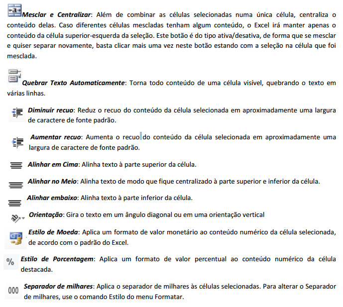 • Da esquerda para a direita: onde o texto durante a digitação ficará sempre próximo a margem esquerda da célula;