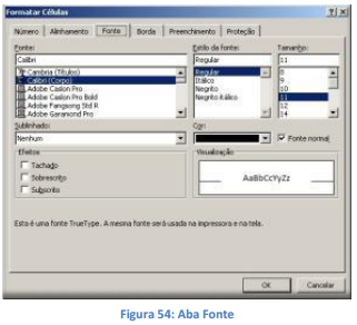 Através desta guia você poderá escolher um modelo de fonte diferente, aplicar um estilo, modificar tamanho, determinar um modelo de sublinhado, alterar a cor da fonte e ainda aplicar um dos três efeitos. Embora as opções desta guia não sejam tão completas quanto à formatação de fonte no Word, são suficientes para modificar a aparência do conteúdo nas células.