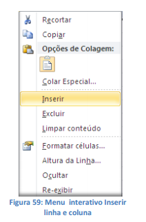 Para inserir uma nova coluna, o procedimento é o mesmo. Clique com o botão direito no identificador da coluna desejada e escolha inserir no Menu Interativo. A nova coluna é colocada antes da selecionada, e esta é deslocada para a direita.