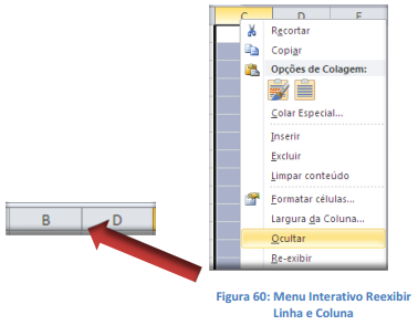 Para reexibir uma linha ou coluna oculta, selecione as duas adjacentes (anterior e posterior) e clique com o botão direito do mouse. Então, escolha o comando Reexibir.