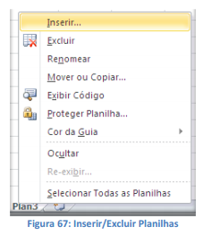 Outra forma de apagar é através do botão Excluir, no grupo Células da guia Página Inicial, e escolha a opção Excluir Planilha. Para incluir novas planilhas, use também o botão Inserir, no grupo Células da guia Página Inicial, e escolha a opção Inserir Planilha.