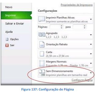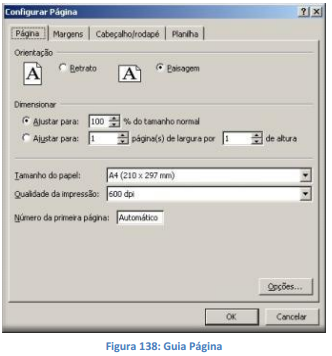 Orientação: Nesta seção, você especifica a orientação da página impressa. Você pode optar por Retrato (papel em pé), ou Paisagem (papel deitado). Só em mudar essa orientação, pode ocorrer do número de páginas que seriam geradas para imprimir a planilha, seja modificado.