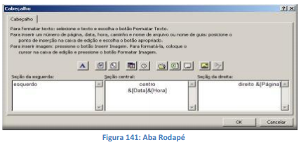 Rodapé: Clique em um rodapé interno na caixa Rodapé e clique em Personalizar Rodapé para criar um rodapé personalizado para a planilha. Da mesma forma do cabeçalho, o rodapé interno é copiado para a caixa de diálogo Rodapé, onde você poderá formatar ou editar o rodapé selecionado.