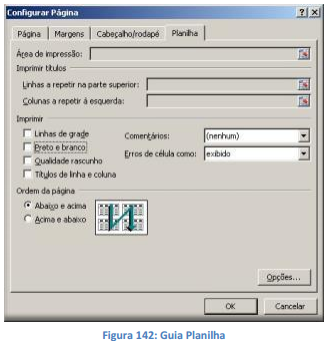 Imprimir: Especifica que parte da planilha será impressa, se a impressão será colorida ou em preto e branco e define a qualidade de impressão. Marque a caixa Linhas de grade para imprimir linhas de grade de célula horizontais e verticais nas planilhas. Selecione a caixa de seleção Preto e branco se tiver formatado dados com cores, mas estiver utilizando uma impressora em preto e branco. Marque a caixa de seleção Qualidade rascunho para reduzir o tempo de impressão. Quando esta opção é selecionada, o MS Excel não imprime nem as linhas de grade nem a maior parte dos elementos gráficos. Clique em Títulos de linha e coluna para imprimir números de linha e letras de coluna em um estilo de referência A1.