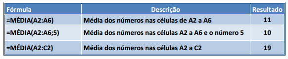 Esta função calcula a média aritmética de uma determinada faixa de células contendo números. Para tal, efetua o cálculo somando os conteúdos dessas células e dividindo pela quantidade de células que foram somadas.