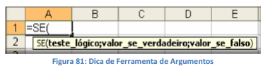 Outro detalhe interessante numa função é a Dica de ferramenta Argumentos. Trata-se de uma dica de ferramenta com a sintaxe e argumentos que é automaticamente exibida à medida que você digita a função. Por exemplo, ao começar a digitar =SE( numa célula, você verá: