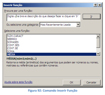 Nome da função: Todas as funções que o Excel permite usar em suas células tem um nome exclusivo. Para obter uma lista das funções disponíveis, clique em uma célula e pressione SHIFT+F3.