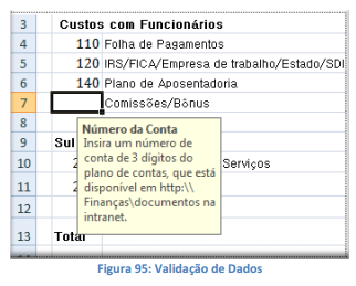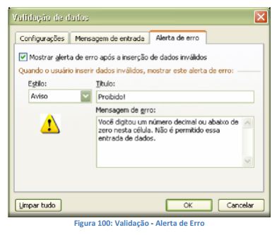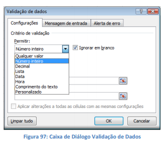 A validação de dados é configurada na caixa de diálogo Validação de Dados.