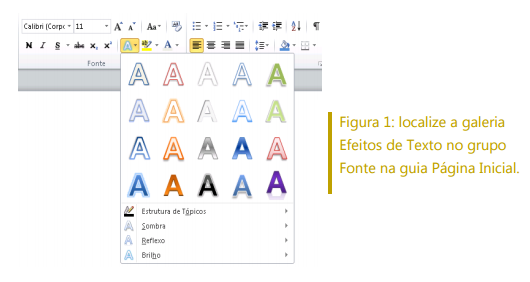 Observação: quando você acessa o comando rotulado WordArt na guia Inserir do Word 2010, obtém uma caixa de texto editável dentro da qual você pode usar os mesmos efeitos de texto discutidos aqui. Esses mesmos efeitos também estão disponíveis para qualquer texto no Microsoft PowerPoint® 2010 e para o texto dos gráficos no Microsoft Excel® 2010. Os efeitos de texto foram introduzidos no PowerPoint e Excel no Office 2007 e são chamados de WordArt nesses aplicativos.
