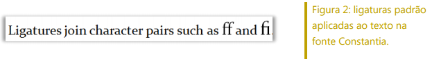 • Ligaturas: as ligaturas proporcionam uma aparência de composição profissional ao seu documento combinando pares de caracteres, como mostrado na Figura 2: ligaturas padrão aplicadas ao texto na fonte Constantia..