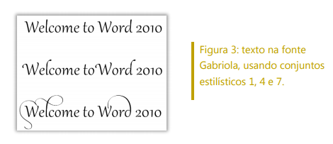 • Conjuntos Estilísticos: use conjuntos estilísticos para adicionar um toque de sofisticação aos documentos, como mostrado na Figura 3: texto na fonte Gabriola, usando conjuntos estilísticos 1, 4 e 7..