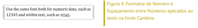 • Formatos de Número e Espaçamento entre Números Alternativos: controle a aparência e o layout dos números em seu texto usando formatos de número e espaçamento entre números alternativos, como você vê na Figura 4: Formatos de Número e Espaçamento entre Números aplicados ao texto na fonte Cambria..