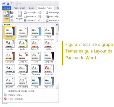 Os temas foram introduzidos no Office 2007 para o Word, PowerPoint, Excel e Outlook, permitindo que você aplique uma aparência consistente e profissional a todo o conteúdo. O Office 2010 adiciona outros 20 temas internos com design profissional de um total de 40 designs internos, assim como o fácil acesso a muitos outros temas no Office.com. Personalize ou crie seus próprios temas para obter uma maneira fácil de implementar sua identidade visual pessoal ou comercial, ou use os designs fornecidos para rapidamente adicionar impacto a qualquer conteúdo.