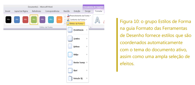 • No Word 2010, você também pode aplicar efeitos de tema ou outros preenchimentos de tema a formas. Os outros preenchimentos de tema disponíveis são os planos de fundo de slides do PowerPoint do seu tema, facilitando a coordenação de todos os documentos do Office 2010. Para acessar os preenchimentos que correspondem aos planos de fundo de slide do PowerPoint, selecione a forma para preenchimento e, em seguida, na guia Formato das Ferramentas de Desenho, no grupo Estilos de Forma, expanda a galeria Estilos de Forma e aponte para Outros Preenchimentos de Tema. (Observe que esses mesmos preenchimentos também estão disponíveis para formas no PowerPoint e Excel, e foram introduzidos nesses programas no Office 2007.)