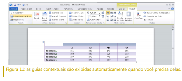 • A Faixa de Opções também fornece guias contextuais para dar a você exatamente as ferramentas corretas para a tarefa. Por exemplo, quando você clica em uma tabela, as guias contextuais aparecem na Faixa de Opções para proporcionar um acesso fácil a todos os recursos necessários para trabalhar com essa tabela.