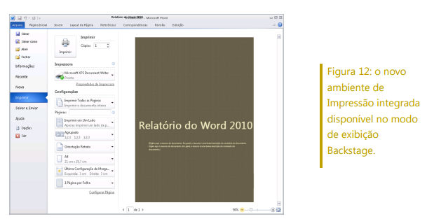 • A guia Imprimir, mostrada na Figura 12: o novo ambiente de Impressão integrada disponível no modo de exibição Backstage., fornece uma nova experiência de impressão integrada com uma página inteira de Visualização de Impressão junto com todas as opções de impressão que você precisa.