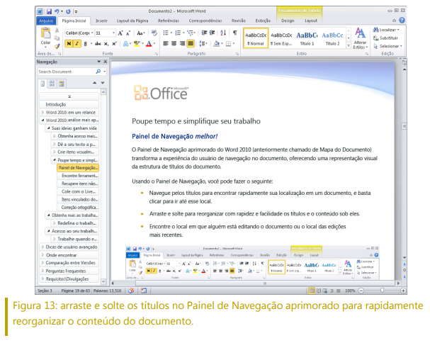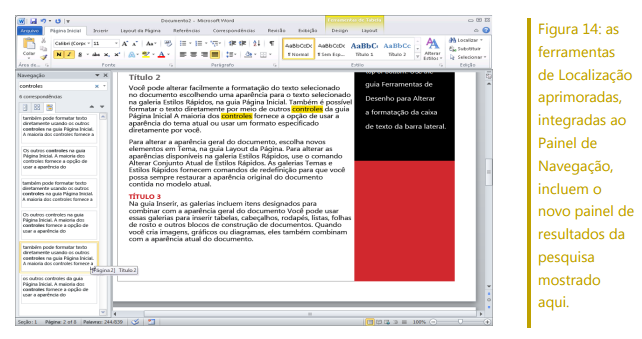 A experiência aprimorada de Localização está agora diretamente integrada ao Painel de Navegação. O Word 2010 pesquisa automaticamente enquanto você digita o termo que está procurando, realçando visualmente todas as correspondências.