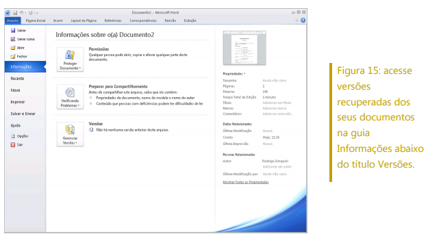 • Precisa de acesso rápido a outro conteúdo na pasta onde seu documento ativo está armazenado? No modo de exibição Backstage, na guia Informações, clique em Abrir Local do Arquivo. Encontre esta opção abaixo do título Documentos Relacionados no painel Propriedades, mostrado na Figura 15: acesse versões recuperadas dos seus documentos na guia Informações abaixo do título Versões..