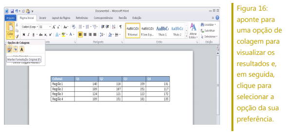 Observação: Colar com Visualização Dinâmica também está disponível no PowerPoint 2010, Excel 2010, Outlook 2010, e para texto no Publisher 2010.