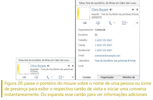 Quando combinado com o Office Communicator ou seu aplicativo de mensagens instantâneas favorito, você pode exibir informações sobre essa pessoa e iniciar o contato instantaneamente via cartão de visita, como mostrado na Figura 20: passe o ponteiro do mouse sobre o nome de uma pessoa ou ícone de presença para exibir o respectivo cartão de visita e iniciar uma conversa instantaneamente. Ou expanda esse cartão para ver informações adicionais sobre seu contato..