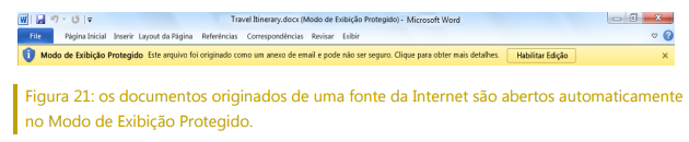 O Office 2010 apresenta o Modo de Exibição Protegido no Word, Excel e PowerPoint, para ajudá-lo a tomar decisões mais informadas antes de expor seu computador a possíveis vulnerabilidades. Por padrão, os documentos originados de uma fonte da Internet, ou que provavelmente possam incluir conteúdo prejudicial, são automaticamente abertos em um Modo de Exibição Protegido. Quando isso acontece, você vê um aviso na barra de mensagens, conforme mostrado na Figura 21: os documentos originados de uma fonte da Internet são abertos automaticamente no Modo de Exibição Protegido., com a opção para Habilitar Edição.