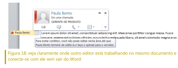 • Onde quer que você veja o nome de outro editor, como mostrado na Figura 18: veja claramente onde outro editor está trabalhando no mesmo documento e conecte-se com ele sem sair do Word., as informações de presença informam a disponibilidade da pessoa. Aponte para o cartão de visita com o nome da pessoa do qual você pode iniciar uma conversa.