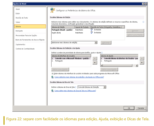 • Quando você define suas preferências de idioma no Word 2010, as define para todos os aplicatiovs aplicáveis do Office 2010, incluindo o Excel 2010, PowerPoint 2010, Outlook 2010, OneNote 2010, Publisher 2010, (excluindo as configurações de Dica de Tela) Access 2010, SharePoint Workspace 2010 e Microsoft InfoPath 2010.