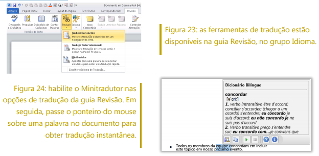 O Word 2010 facilita mais do que nunca a comunicação entre vários idiomas. Obtenha acesso fácil a ferramentas de tradução na guia Revisão do Word 2010, conforme mostrado na Figura 23: as ferramentas de tradução estão disponíveis na guia Revisão, no grupo Idioma.. Ou então, use o Minitradutor (antigamente chamado de Dicas de Tela de Tradução) aprimorado para traduções imediatas.