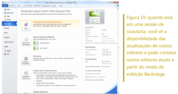 Conforme mostrado na Figura 18: veja claramente onde outro editor está trabalhando no mesmo documento e conecte-se com ele sem sair do Word. e Figura 19: quando está em uma sessão de coautoria, você vê a disponibilidade das atualizações de outros editores e pode contatar outros editores atuais a partir do modo de exibição Backstage., você pode ver o ícone de presença ou a barra de presença em diversos locais enquanto está em uma sessão de coautoria no Word 2010. Além da coautoria, você também pode ver informações de presença dos autores, gerenciadores e últimos editores no painel Propriedades, na guia Informações, no modo de exibição Backstage.