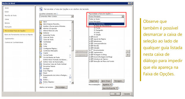 Para iniciar a personalização da Faixa de Opções, basta selecionar a guia antes da qual você deseja colocar sua nova guia personalizada e clique em Nova Guia. Ou então, expanda uma guia para exibir seus grupos, selecione o grupo após o qual você deseja colocar um grupo personalizado e clique em Novo Grupo. Você pode então adicionar comandos do lado esquerdo da caixa de diálogo.