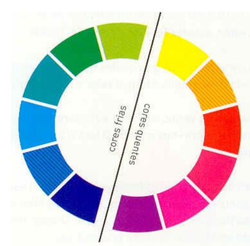 Normalmente denominamos de cores quentes as que tendem para o amarelo, e suas matizes com os alaranjados e avermelhados e, de cores frias as que tendem para o azul, e as matizes entre o verde, azul e violeta. As cores quentes estimulam a circulação do observador e são profundamente excitantes, sensuais, despertam calor humano e são favoráveis a aglomeração de confraternização ou cooperação mútua. Conotam também proximidade, densidade, materialidade; elas avançam em nossa direção, diminuindo o espaço. Em mensagens transmitem carinho e aproximação fraternal.